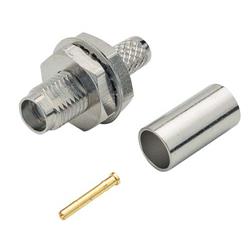 This female single D bulkhead mount SMA connector is designed for crimp attachment to RG58 coaxial cable utilizing readily-available crimp tools with standard crimp sizes: .213" for the crimp ferrule and .042" for the pin. The connector includes a nut and washer to facilitate panel mounting. This 50 Ohm subminiature connector utilizes a threaded coupling mechanism making it a popular choice in higher frequency applications.