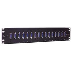 An L-com exclusive, four 19" x 3.5" rack panels are available with 16 shielded D-sub slimline couplers. Color of panel is black. Couplers female to female and fully shielded. Helpful white numbered legend printed 1-16.